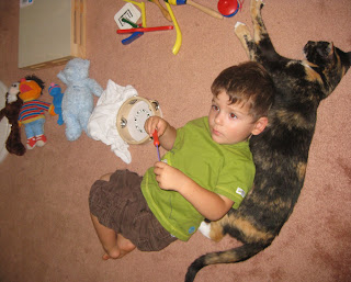 James has gotten much better about saying sorry, excuse me, please and thank you. Sometimes, he goes out of his way to bump into Buca (our kitty) just so he can say, "Oh! Excuse me, Buca!" :) And on Monday he walked around the house saying, "Thank you so much!" over and over. It's wonderful to see him developing these kind mannerisms.