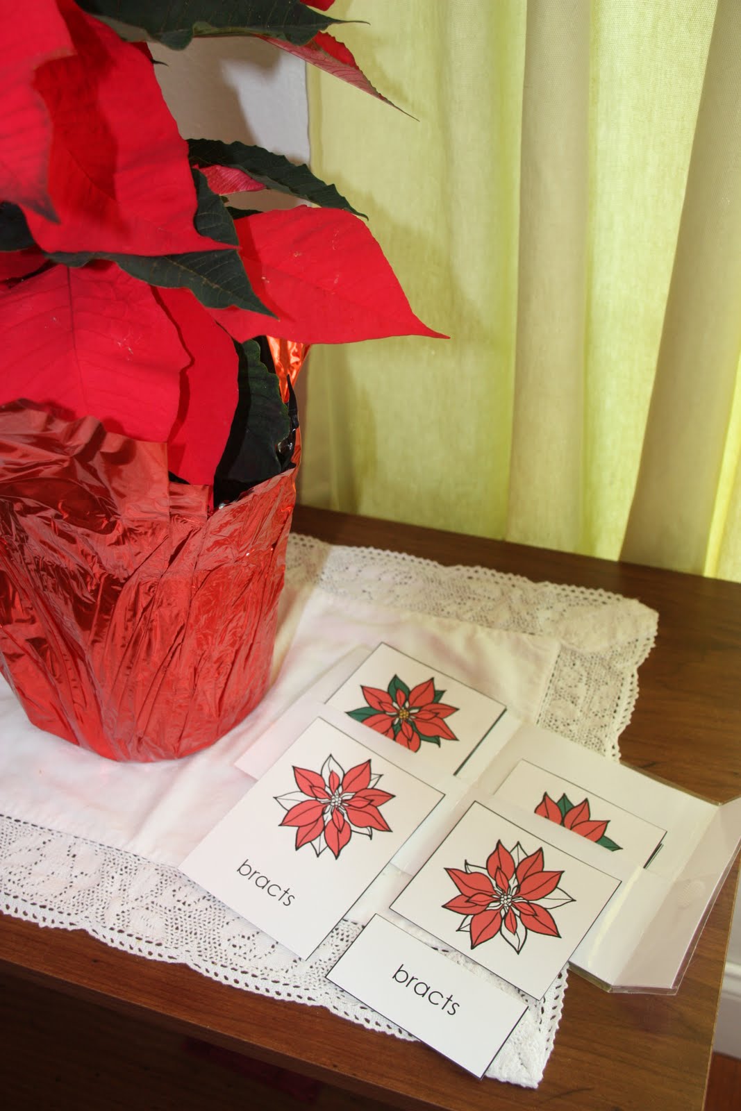 Poinsettia Three Part Cards. I found these beautiful cards on abcteach and I purchased a real Poinsettia plant so James could have a living visual guide as well.