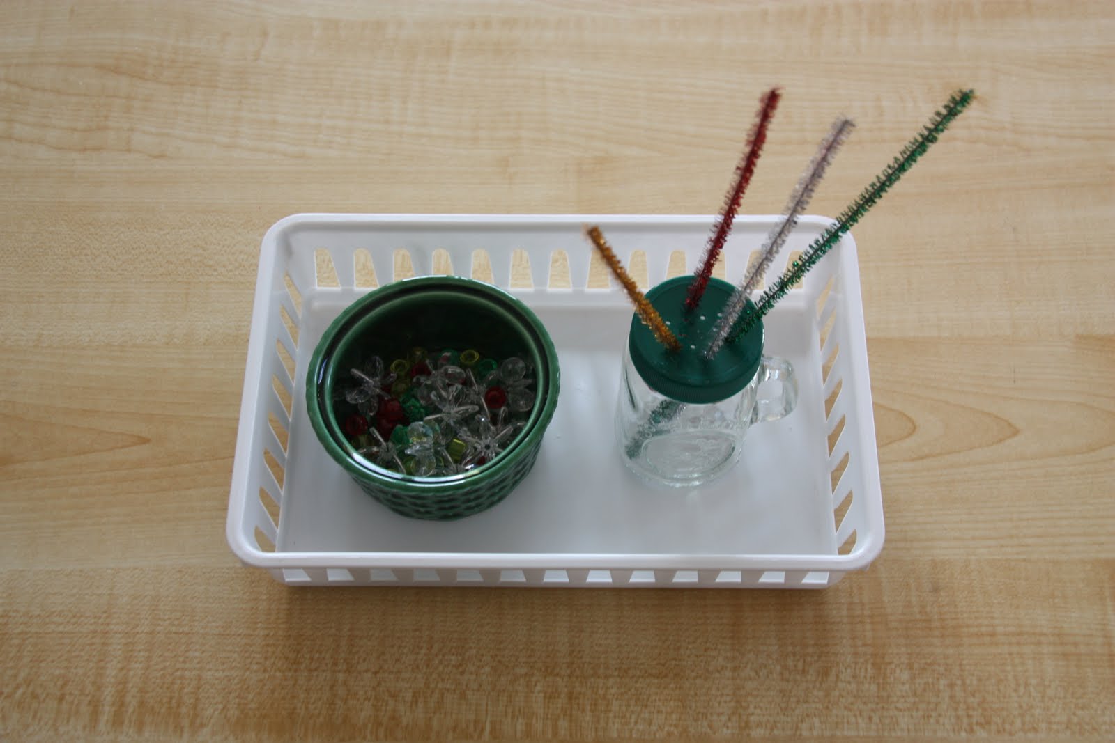 Stringing Pony Beads. I saw this idea ages ago on Itty Bitty Love. The pipe cleaners (aka chenille sticks) are pushed into the holes on the top of a small shaker. Fun and simple!