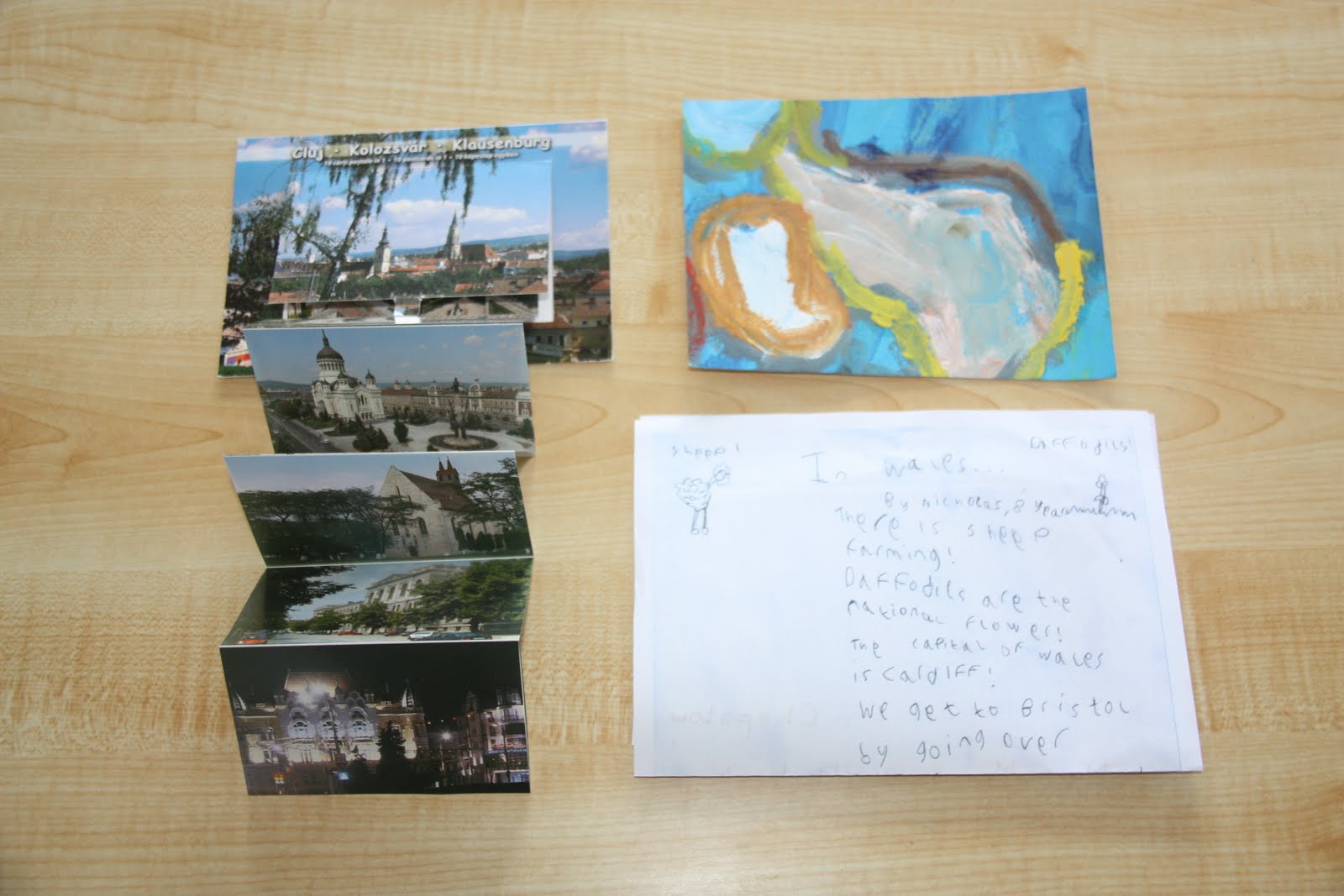 loves this postcard and spent the first few days of its arrival carrying it around with him. The colorful painting at the top was sent to us from a sweet little boy in Spain as a part of our