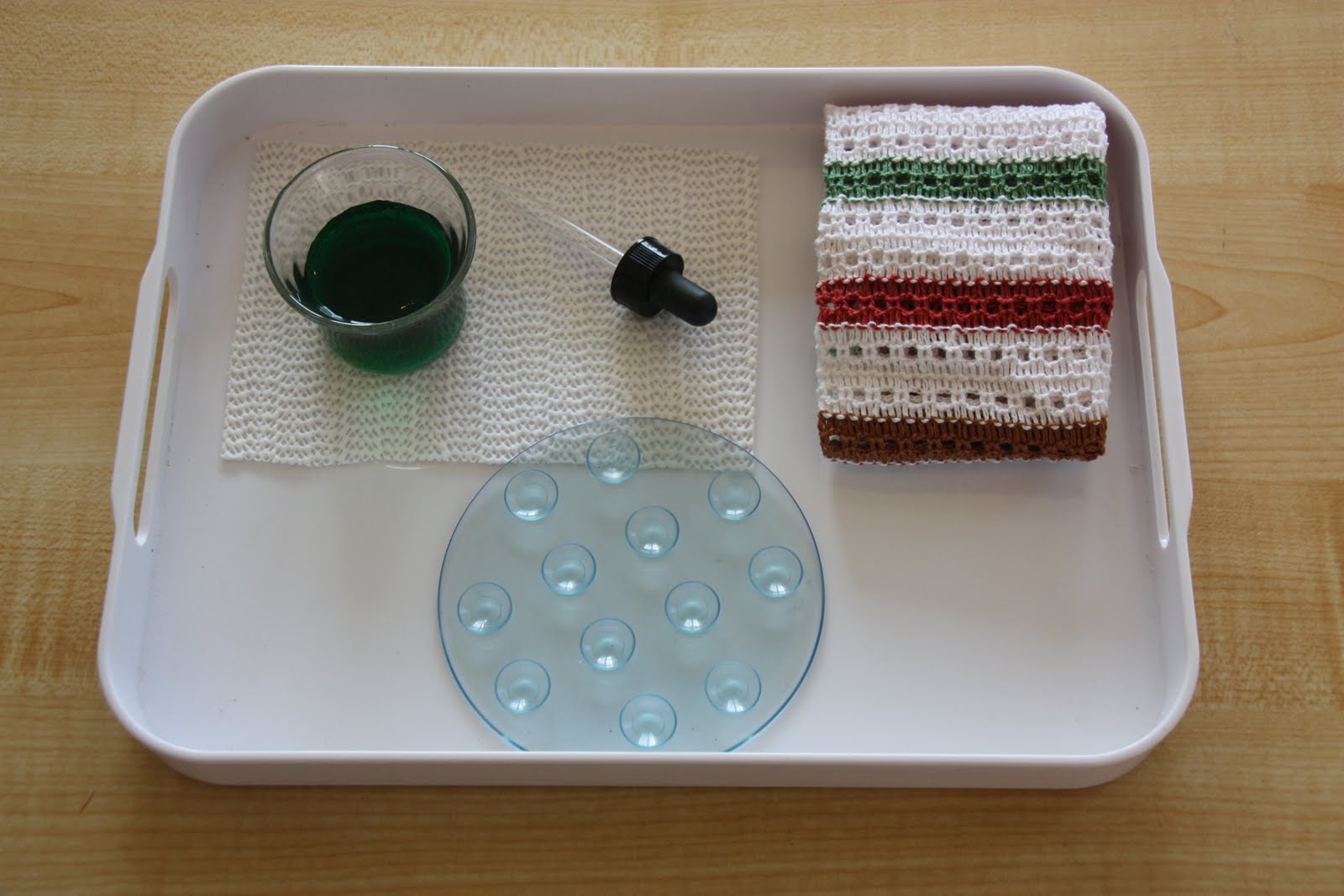 Using A Dropper. James will transfer the green water from the glass by way of the dropper and then release the water in small amounts into each individual suction cup. The washcloth is provided so he can wipe up any spills. We've done this in the past and James just loves it.