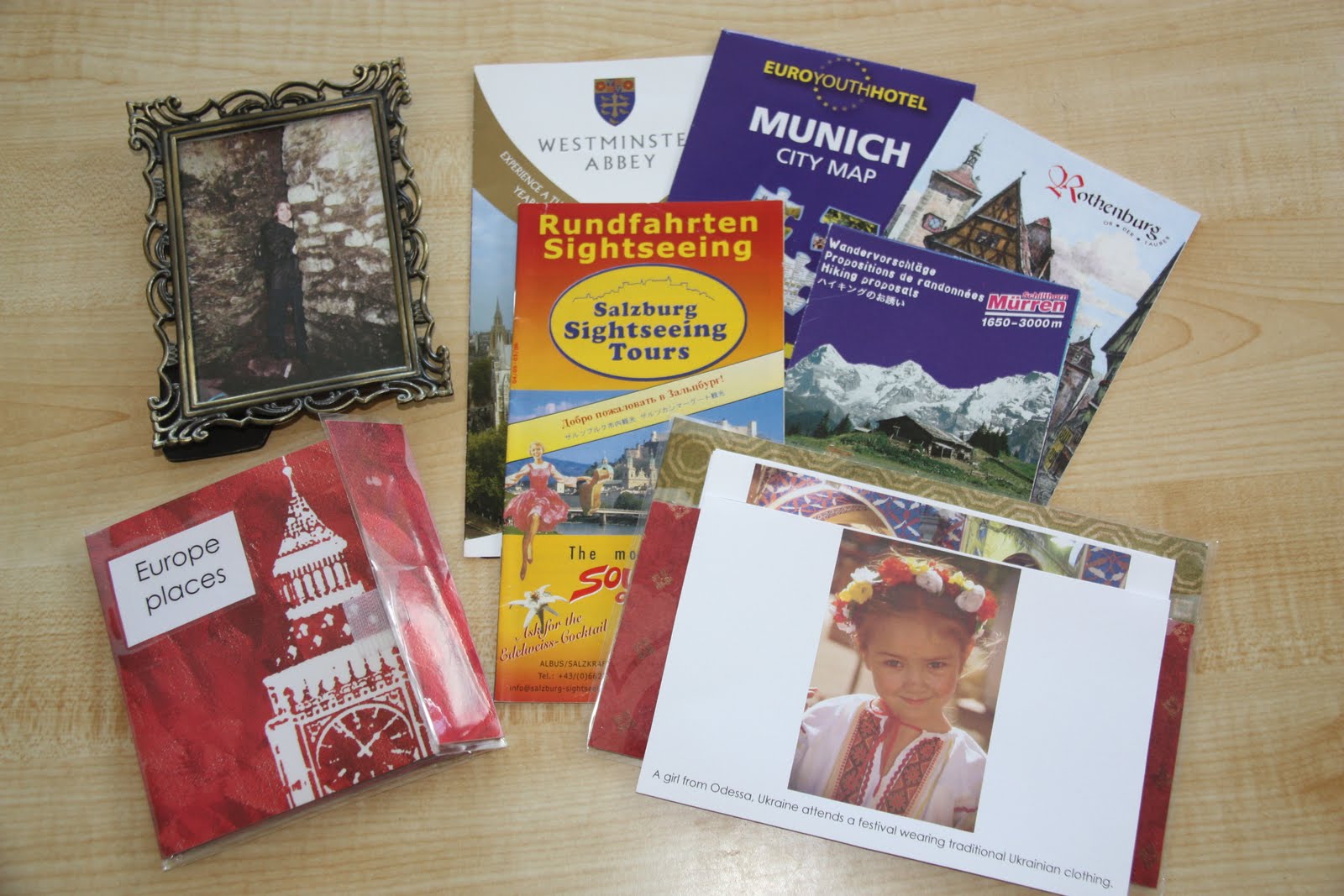 here and the brochures were collected by me as I traveled. I have quite a few photos from my travels and, when the time comes for us to explore our Europe bag, I'll pull them out and share them with James. This particular photo - the one in the upper left hand corner - is of me on the very dark and narrow staircase within the