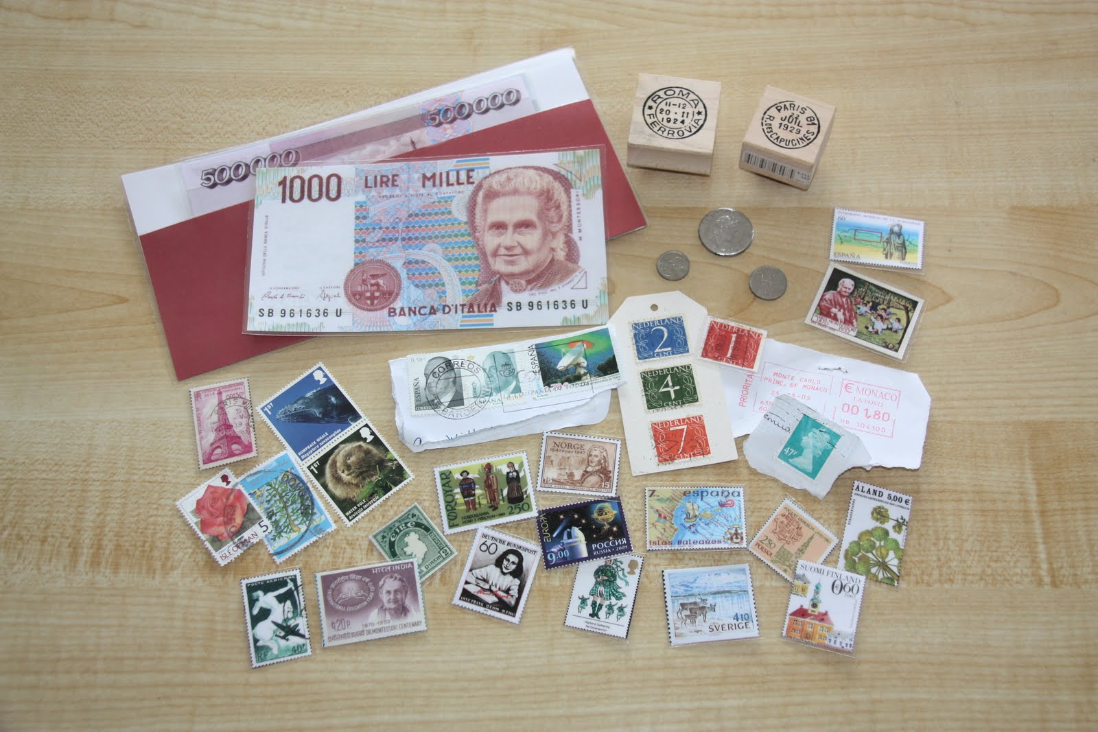 Money, stamps, and stampers. The coins and some of the stamps are real, but most of the items in this photo are images I found on Google and then printed and laminated. The 1000 Lire bill above has an image of Maria Montessori on it! Unfortunately, my stash of European currency