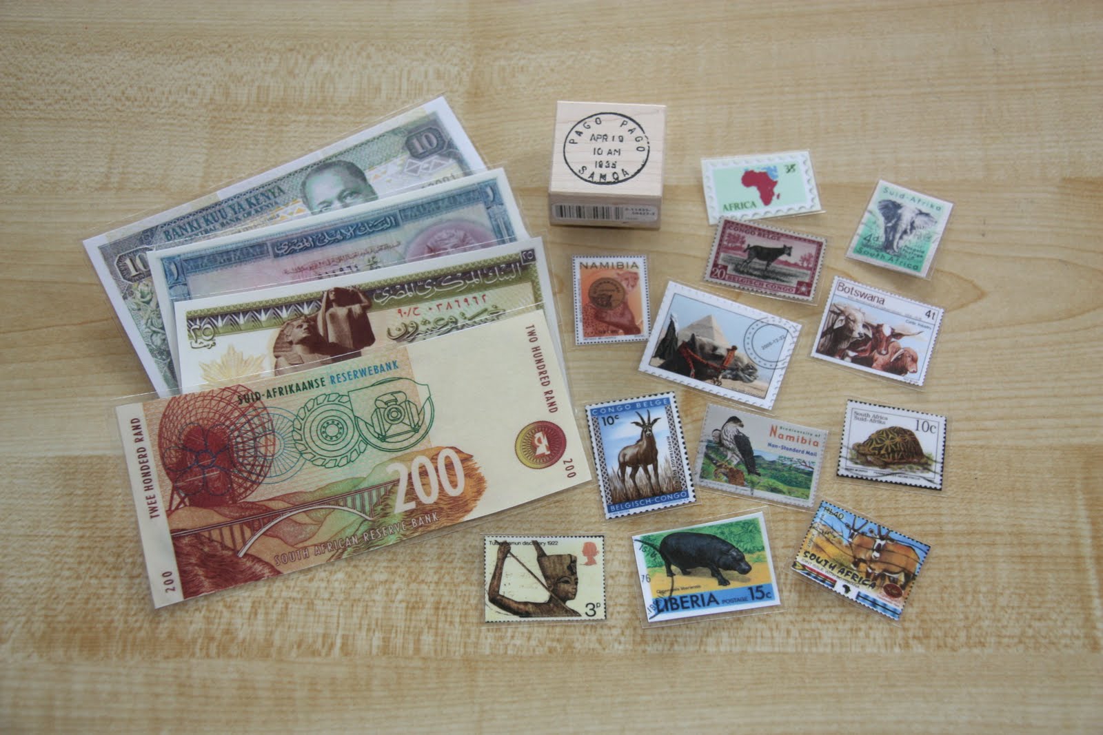 Money, stamps, and stampers. The coins and some of the stamps are real, but most of the items in this photo are images I found on Google and then printed and laminated. The 1000 Lire bill above has an image of Maria Montessori on it! Unfortunately, my stash of European currency (some date from before the Euro was introduced) and stamps are not here in Bermuda with me. The stampers will make for a fun activity when we explore this continent.