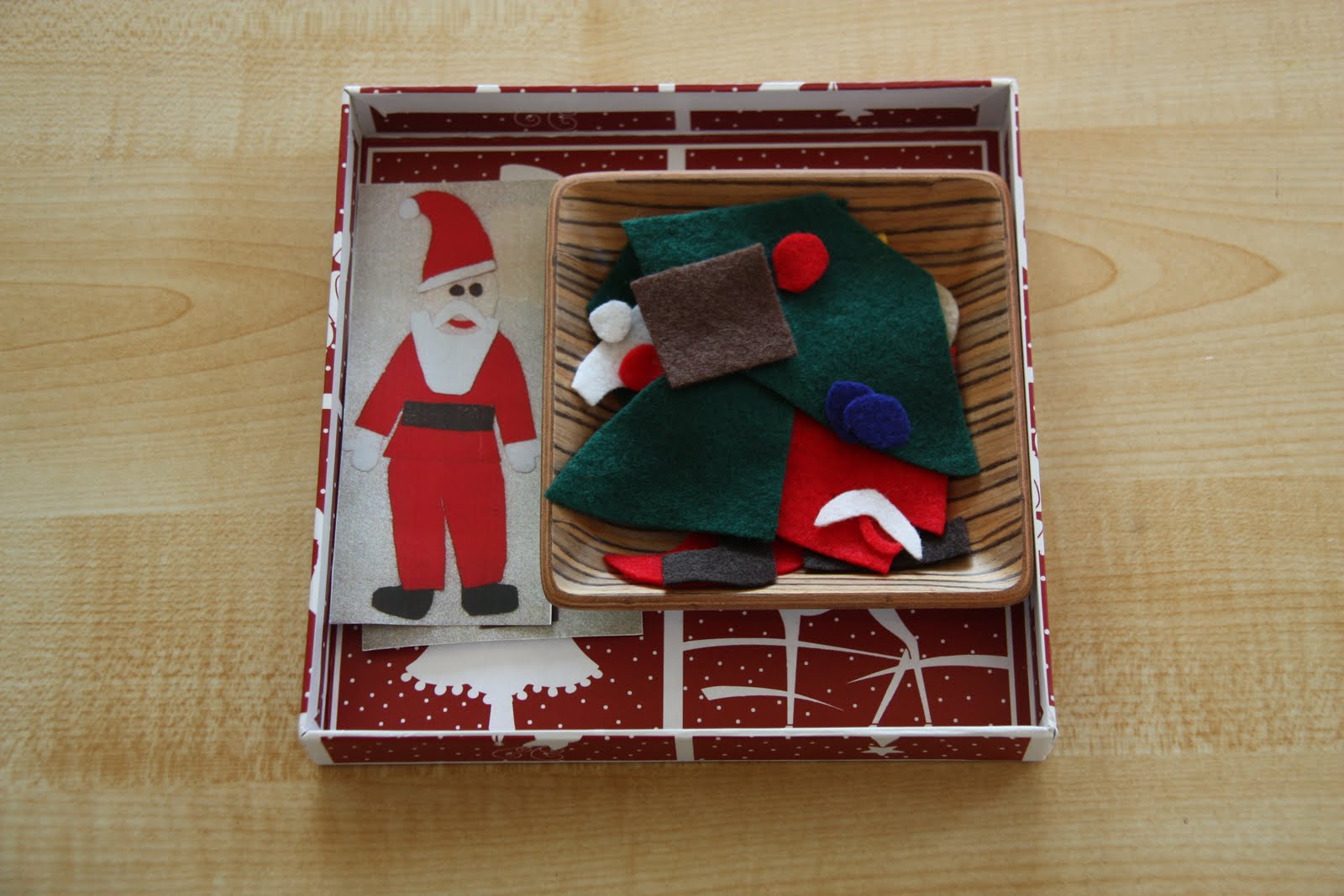 Build A Santa & Christmas Tree. These are our "Felt Friends" from last year. Instead of separating the two as I did last year, I put all the pieces together for an added challenge.