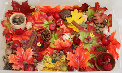 I've been squirrelling away (ha!) since the beginning August for our fall tub, but you've some ideas I hadn't come up with, like the cinnamon sticks! How about a fine motor activity of sticking cloves into an apple or orange?