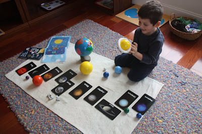 Solar System Flashcards (Science/Language). These cards have really beautiful photos and are full of significant, yet easy to follow facts on the reverse sides. You can buy them through Montessori Services.