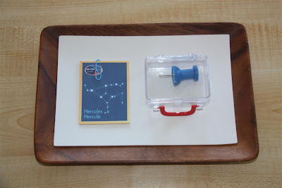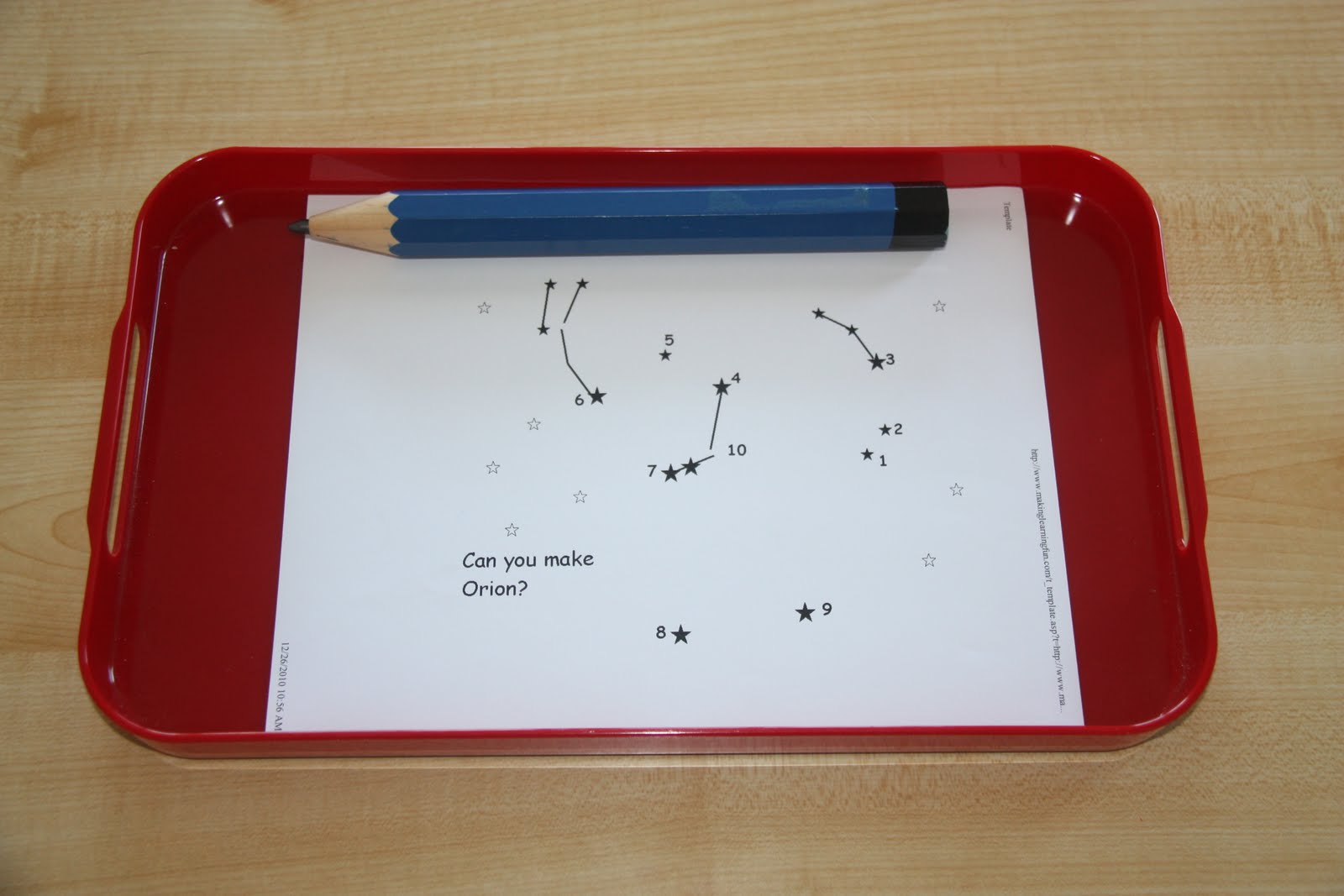 Pin Punching (Practical Life). I found these jumbo pins at the dollar store and printed out the constellation cards from here. The added bonus to this activity is that once James has them all punched we'll go into a dark room, shine a flashlight behind them and project the images onto a wall!
