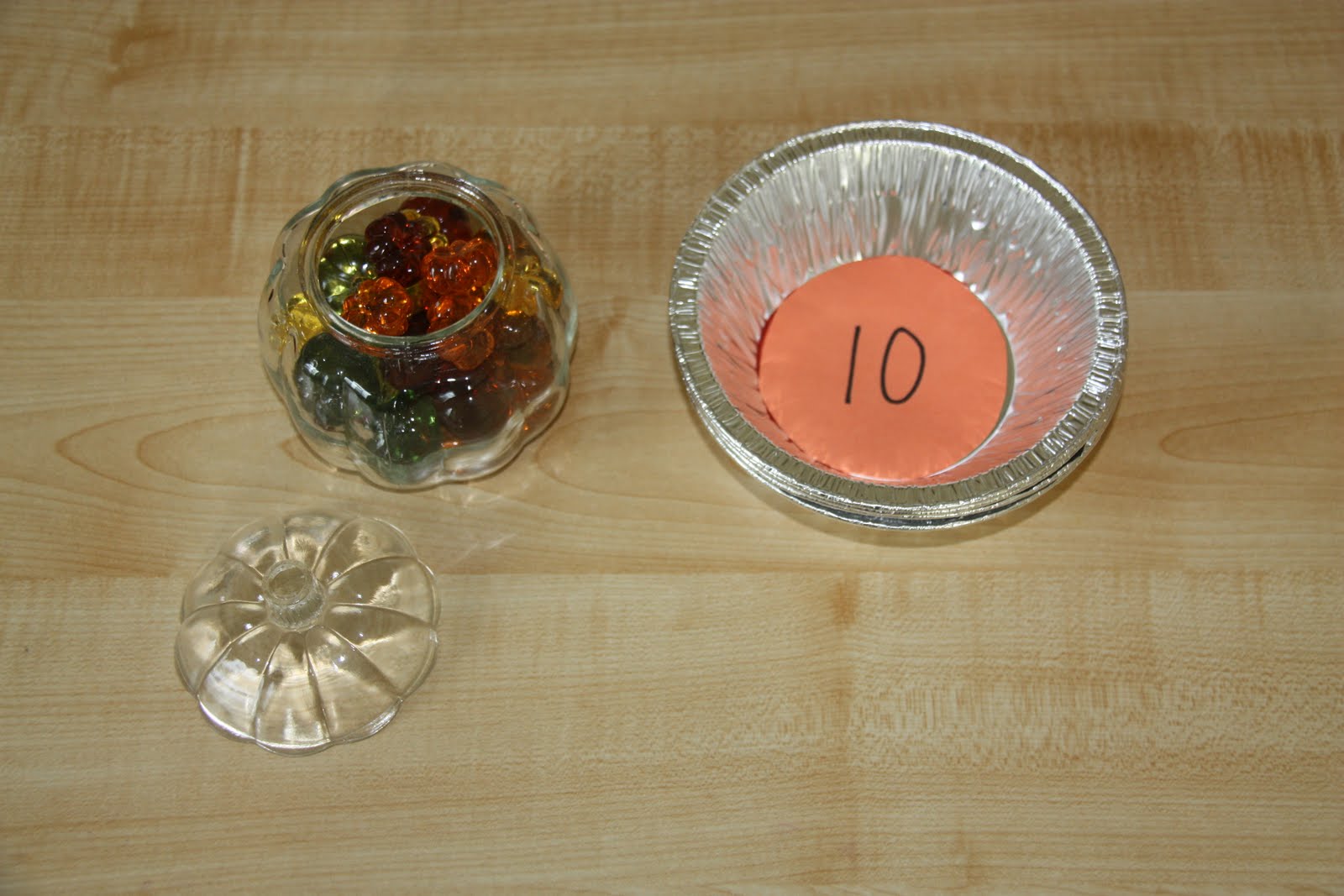 Pumpkin Pie Game. This is just like the one we did last year, only this time I used larger numbers and small plastic pumpkins (which I found at Hobby Lobby while I was in the states - I highly recommend them). This work was a huge hit with James and we ended up doing much more with it than I originally planned. We worked on the concepts of less/more, bigger/smaller, some/all/none and also addition/subtraction.